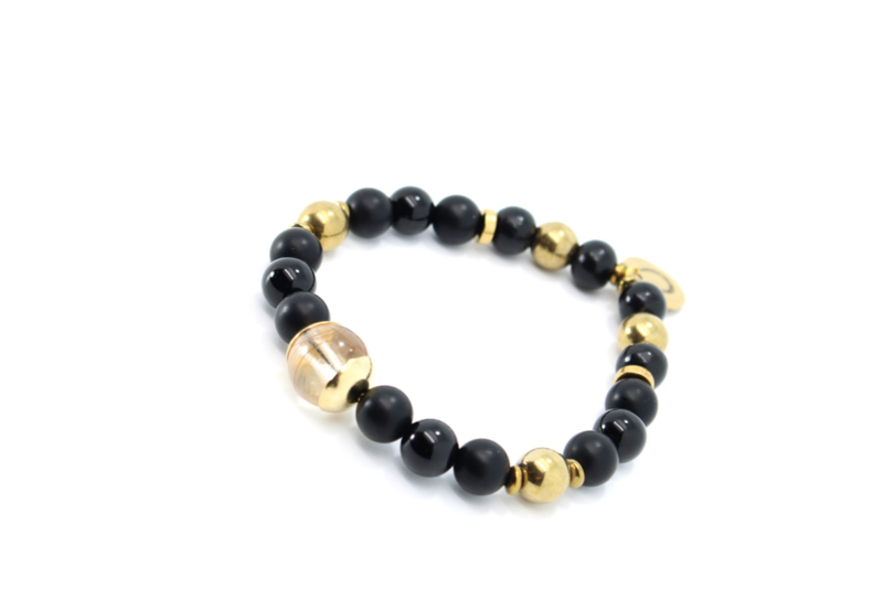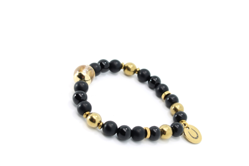 Armband Goldy heeft een enorm chique uitstraling door de combinatie van zwarte stenen in combinatie met gouden stainless steel tussenstukjes.
