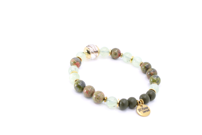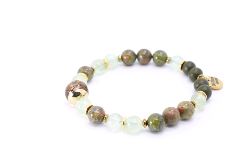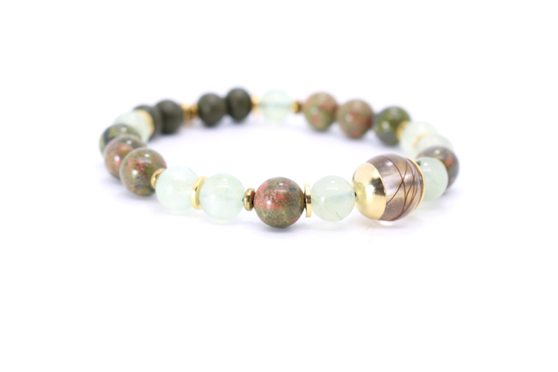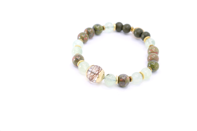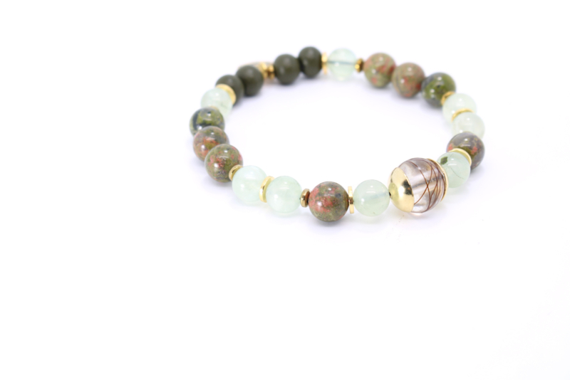 The prehnite and unakite in this bracelet enhance each other. Both are incredibly calming and relaxing.