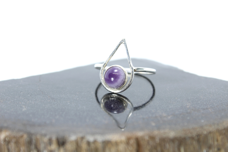 OverviewThis hand-forged ring is a cheerful warrior. The drop-shaped line around the amethyst stone is approximately 20mm long. The amethyst itself is approximately 8mm in diameter and pops out of the ring. A ring for a sweet yet feisty woman.